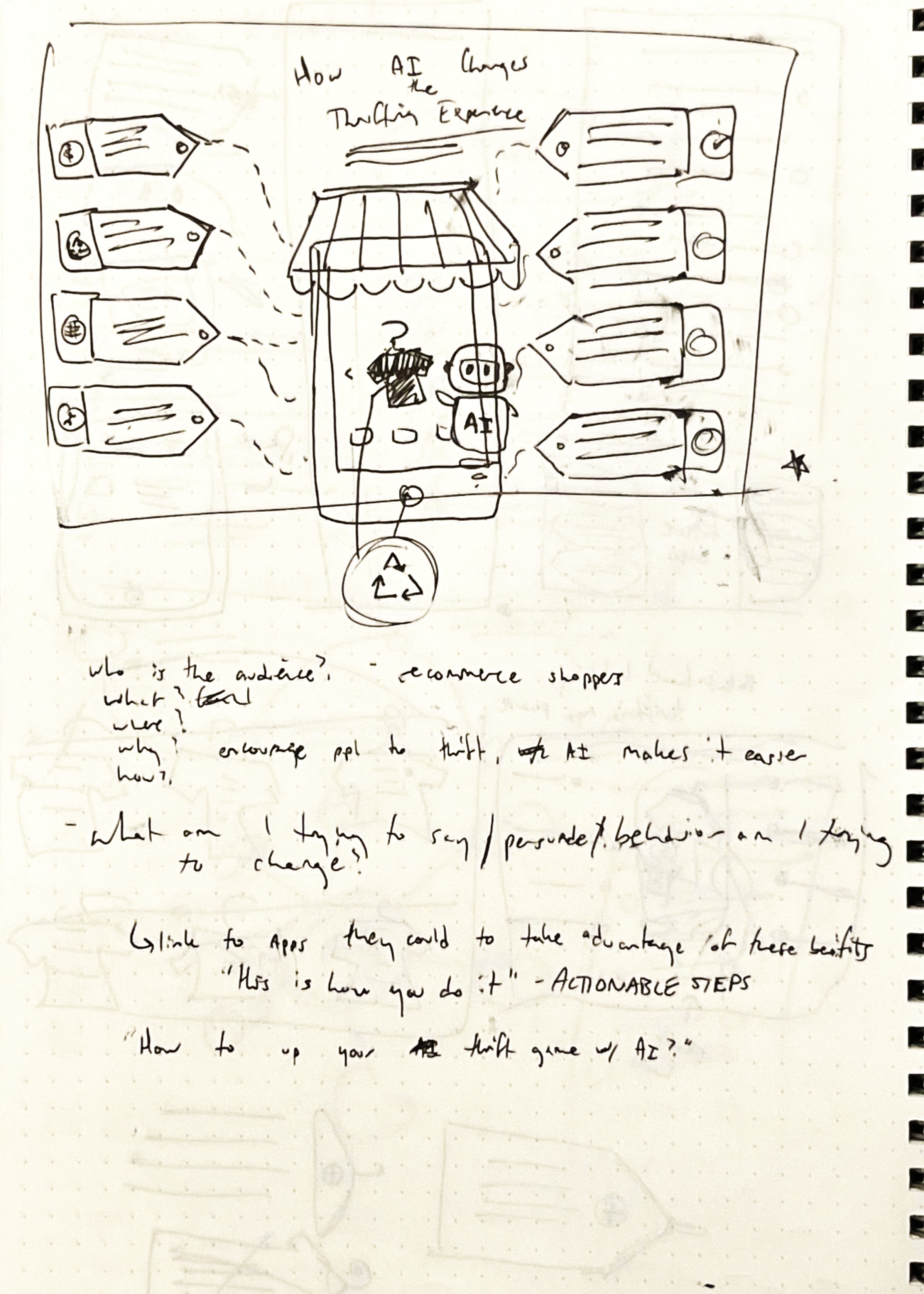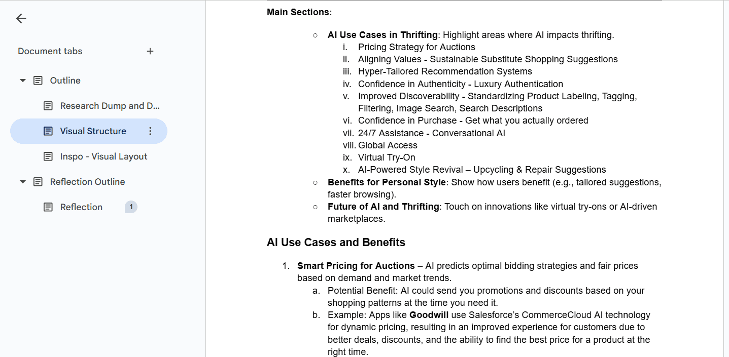 Because I already had a broad interest in how AI is shaping consumer behavior across different industries, particularly in fashion, I was able to notice a gap in conversation around secondhand fashion and re-commerce, where personalization and sustainable values are increasingly important. Inspired by my own experiences with online thrifting and AI-powered recommendations, I asked: What if AI could help users find secondhand clothing as easily as fast fashion? I then narrowed the scope to focus on how AI improves the secondhand shopping experience—through smarter search, trend prediction, and visual matching—while promoting sustainability. The final concept aimed to combine my interests in tech, fashion, and design, and offer both insight and encouragement for users to embrace AI-powered thrifting.